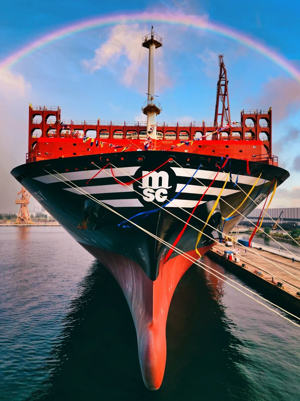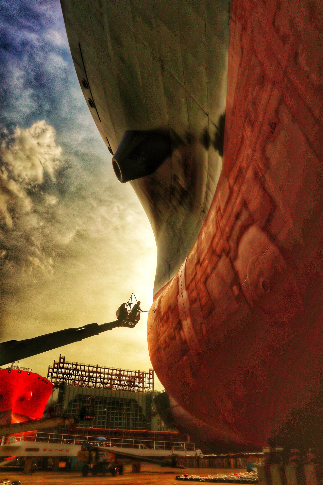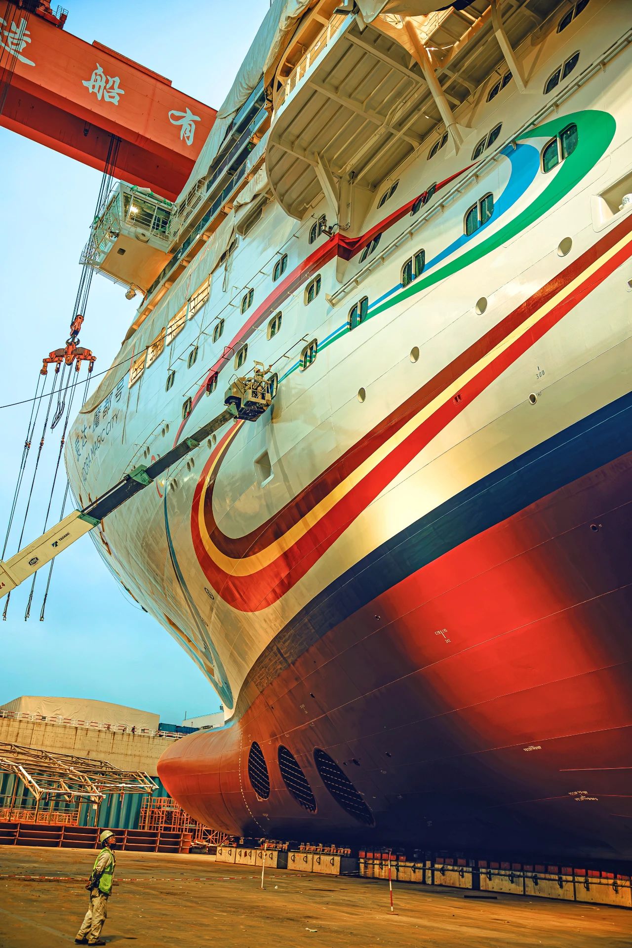 壯麗的船身如山巒一般,余暉映襯下,一位工人正駕駛高空車完成外板清潔施工,構成一幅絕美的畫面。
