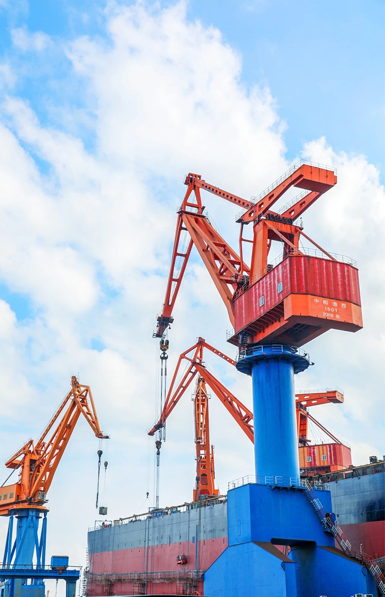 本幅作品拍攝于中船澄西主建船型82000噸散貨船船臺搭載過程中,高矮錯落的吊臂構成了如音符一般的工作樂潮。