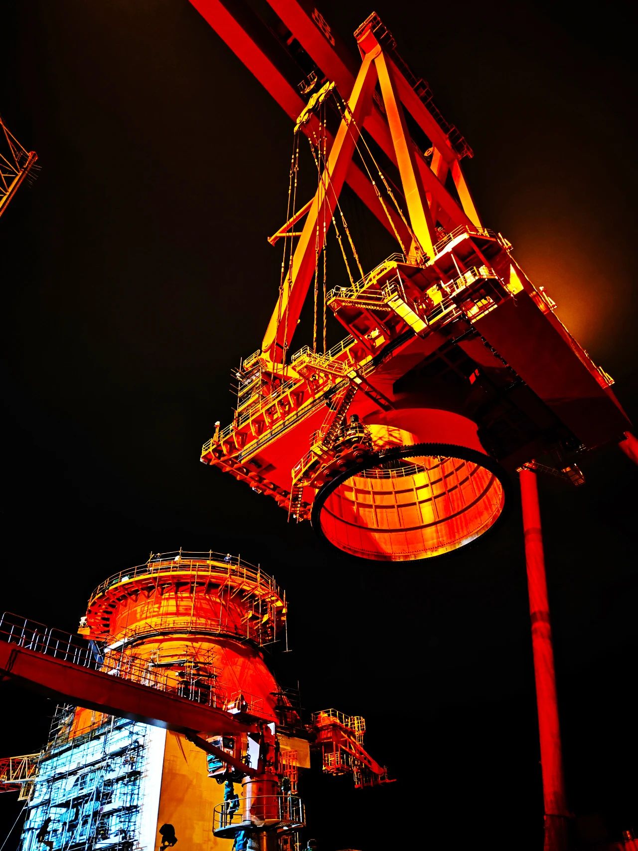 在武漢船機平臺總裝現場,華夏金租神大平臺配套的1200噸起重機正在安裝,大件吊裝各項準備工作繁瑣,一切就緒時,天已經黑了,現場一鼓作氣開始吊裝對接,展現了船舶人只爭朝夕、不負韶華、忘我工作精神風貌。