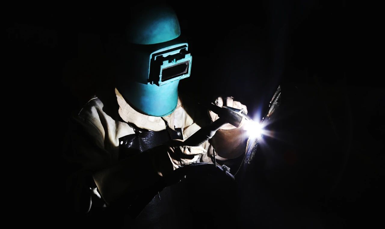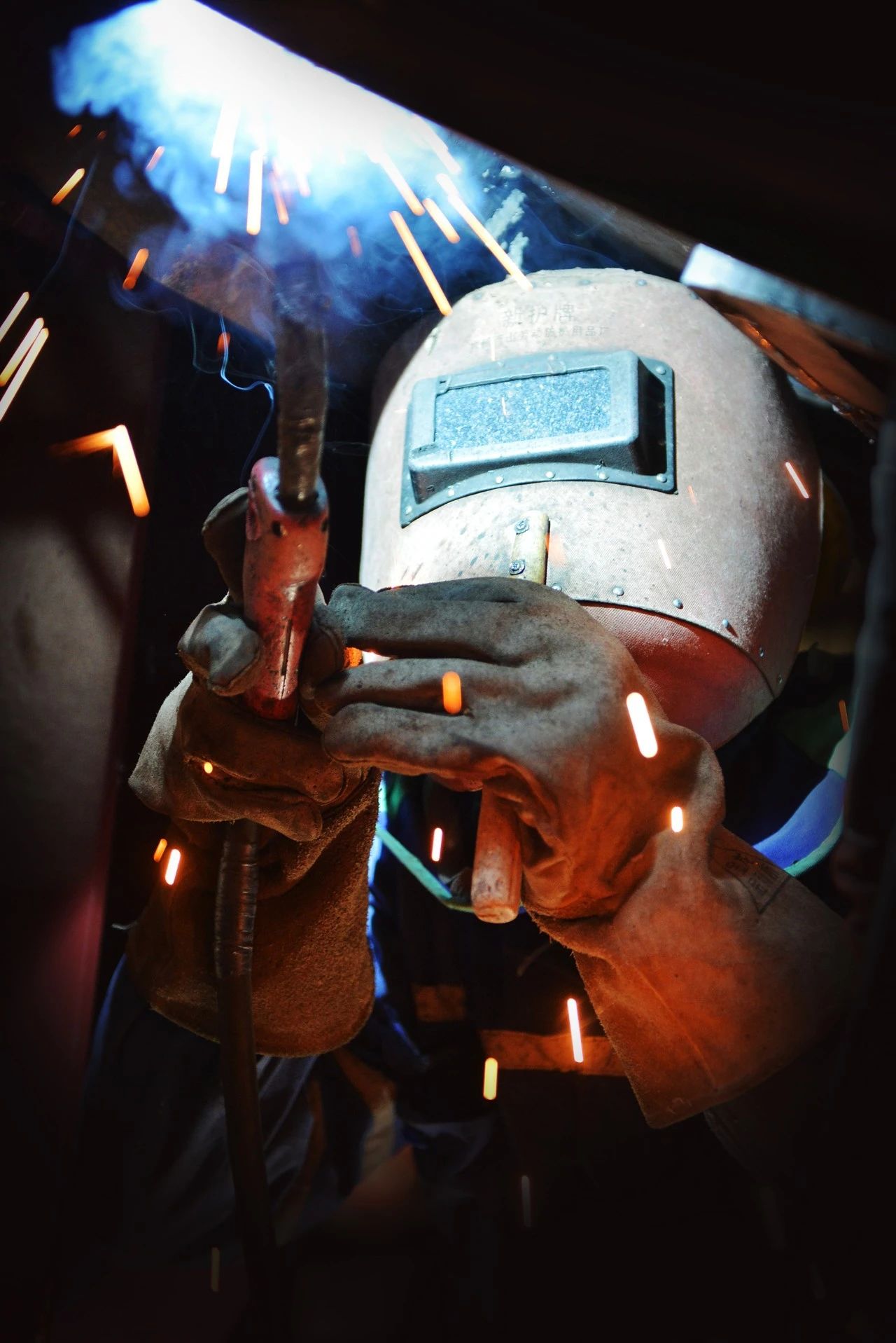 電焊工,就文沖修造最美的一線工人,他們從頭到腳“全副武裝”,一副墨鏡,一個面罩,一套包裹的嚴嚴實實的工作服是他們的色調。此起彼伏吱吱作響的燒焊聲,黃紅藍色的焊花,伴著刺眼的弧光,如噴泉一般是他們奏響的樂章。
